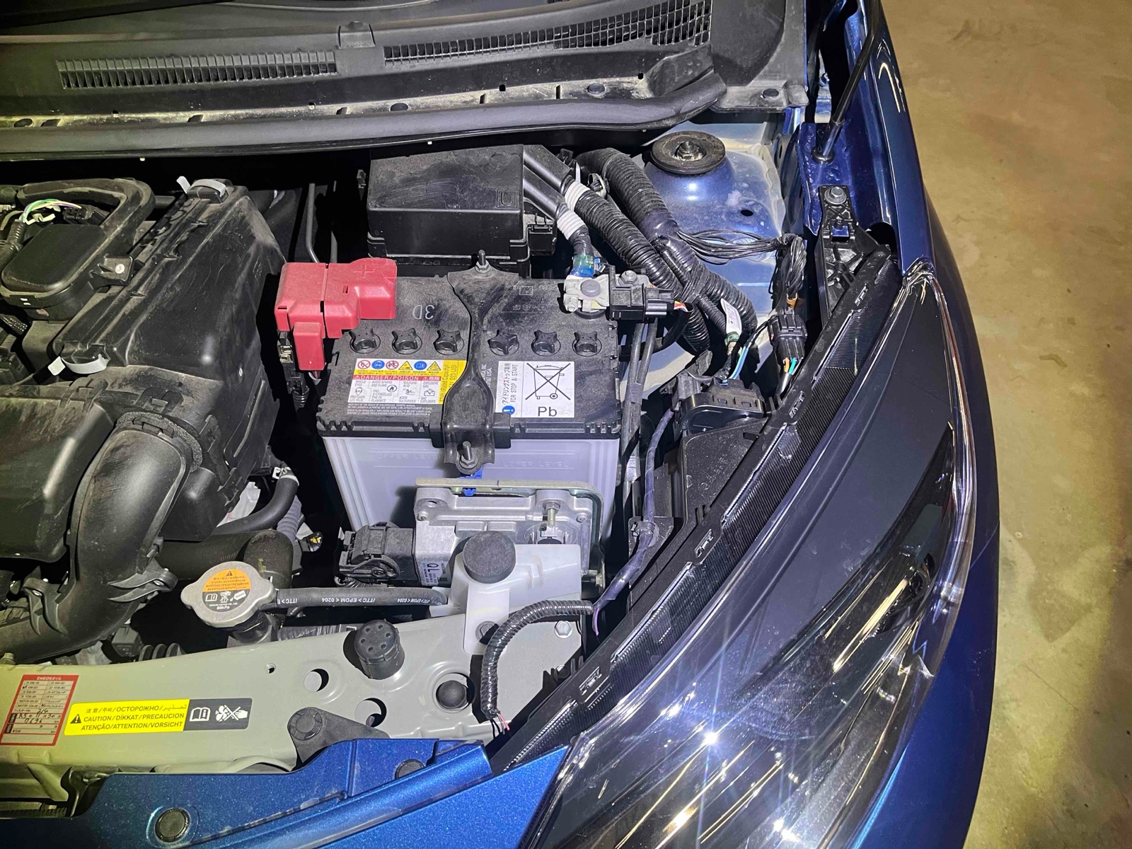 The wiring harness located next to the battery shows signs of tampering or repair. The protective loom is partially unwrapped, and several wires are covered with non-standard white electrical tape, indicating a potential past electrical issue or non-professional modification.